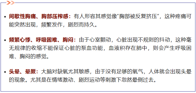 一旦突发胸闷、胸痛且不能缓解,或症状短暂但频繁发作,要高度警惕。如果突然心跳加速或感觉心脏停跳,然后剧烈搏动,并伴随眼前发黑,或出现无诱因的持续乏力、睡眠中惊醒等,均需及时就医排查心脏问题。
